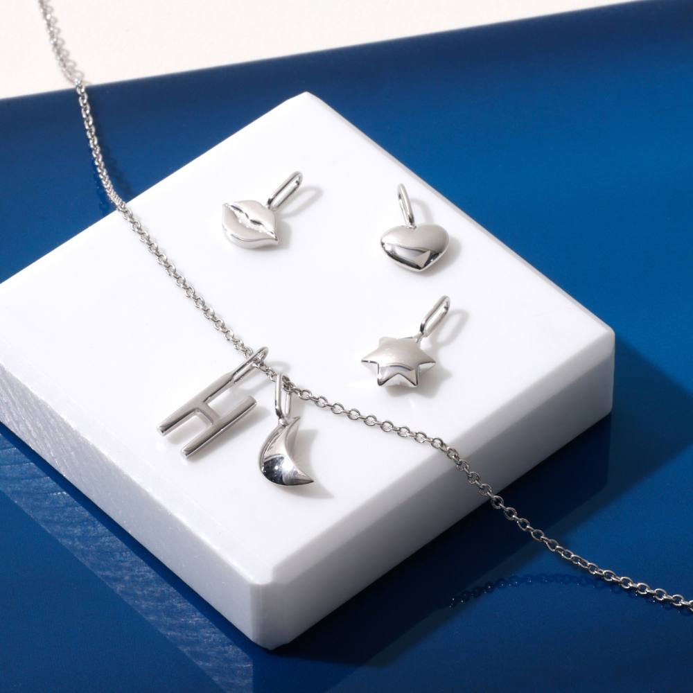 Unikt charm koncept - design din egen halsk?de. Baseret p? Arne Jacobsens h?ndtegnede bogstaver fra 1937. K?derne findes i fire forskellige l?ngder i 925 sterlings?lv eller 18K guldbelagt s?lv.